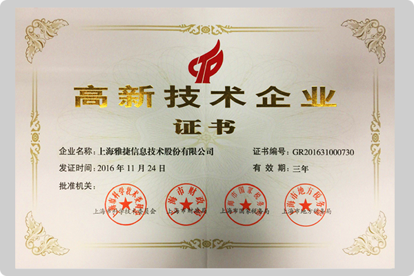 雅捷于2016年通过高新技术企业认证