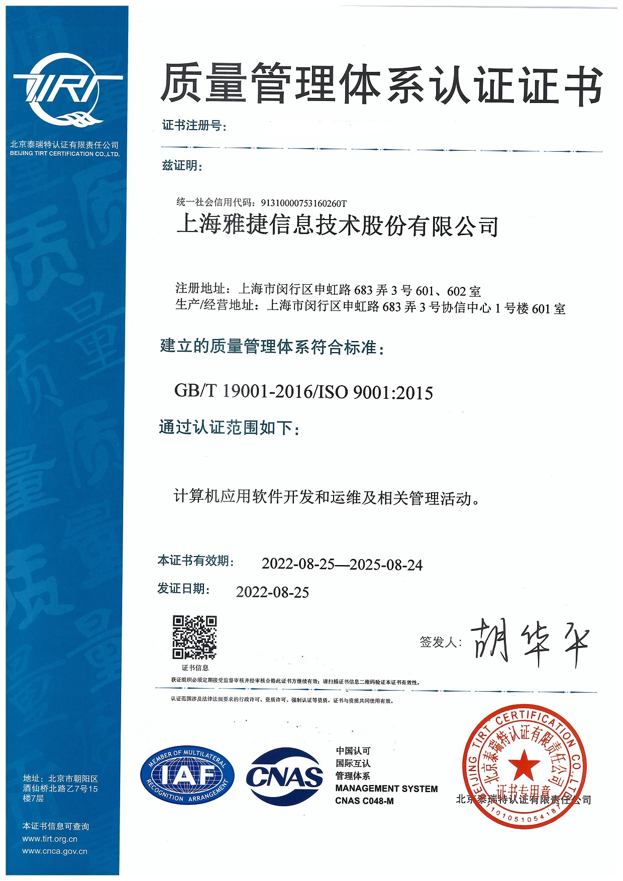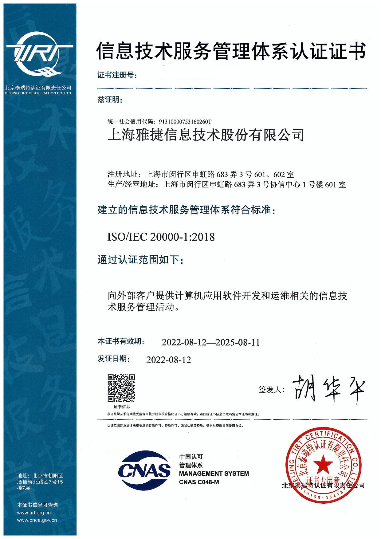 雅捷注重企业管理,通过ISO20000质量体系认证